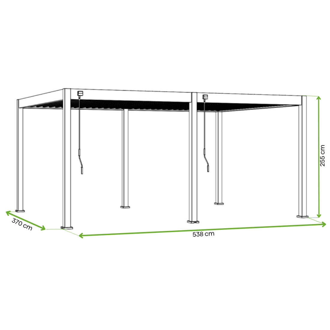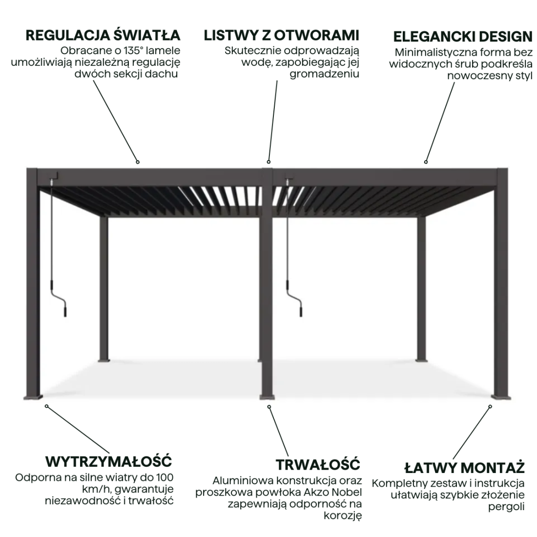 Pergola Gutroof DELUXE 3.6×5.3 to solidna konstrukcja wykonana z aluminium, co gwarantuje odporność na korozję. Produkt wyposażono w regulowany dach z lamelami oraz nowoczesny system odprowadzania wody z ukrytymi elementami montażowymi, co zapewnia estetyczny wygląd.