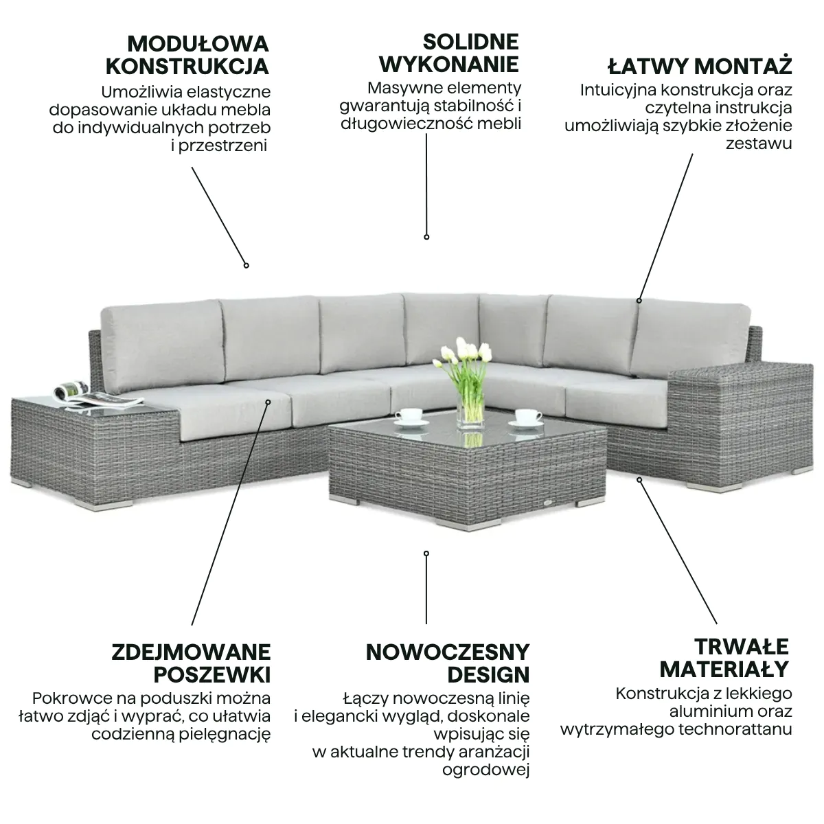 Zestaw został zaprojektowany tak, aby zapewnić maksymalny komfort wypoczynku przy jednoczesnej trwałości i odporności na codzienne użytkowanie.