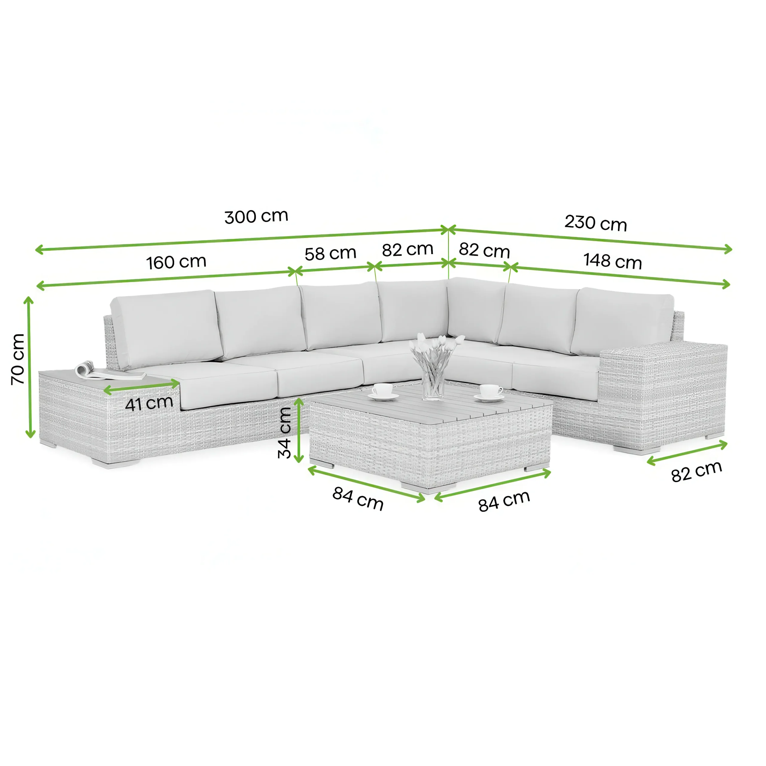 Narożnik AVOCADO to propozycja dla osób, które cenią sobie połączenie minimalistycznego designu z wysoką funkcjonalnością. Jasna, biało-szara kolorystyka technorattanu nadaje mu lekkości i sprawia, że doskonale wpisuje się w nowoczesne aranżacje ogrodowe, tarasowe oraz wnętrzarskie.