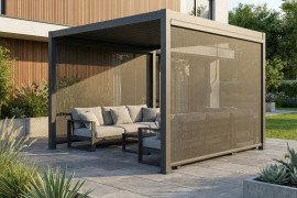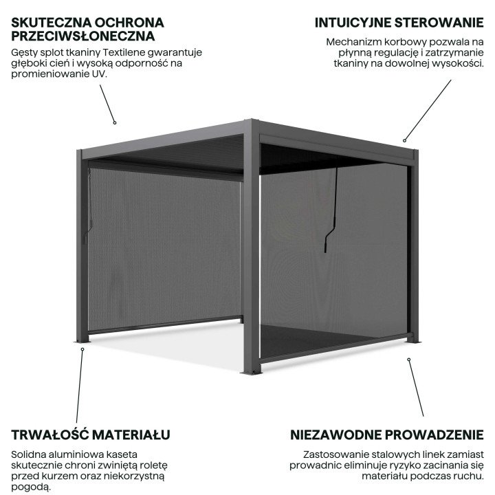 Roleta do pergoli z serii PRIMARY o szerokości 3 m w odcieniu antracytowym została zaprojektowana z myślą o zapewnieniu prywatności i ochronie przed słońcem. Wykonana z materiału Textilene o gramaturze 420 g/m2, roleta oferuje skuteczną ochronę przeciwsłoneczną, jednocześnie redukując nagrzewanie się przestrzeni tarasowej. Zintegrowana kaseta aluminiowa oraz stalowe linki jako mechanizm stabilizacyjny zapewniają trwałość i płynność działania produktu.