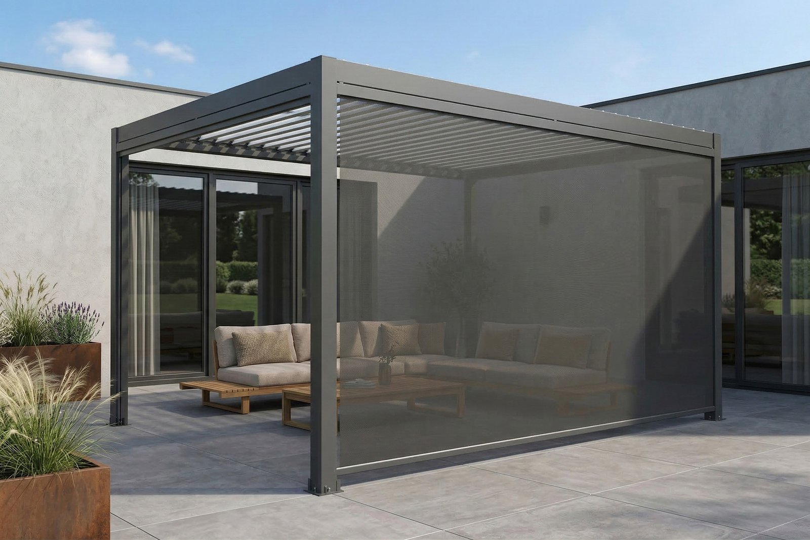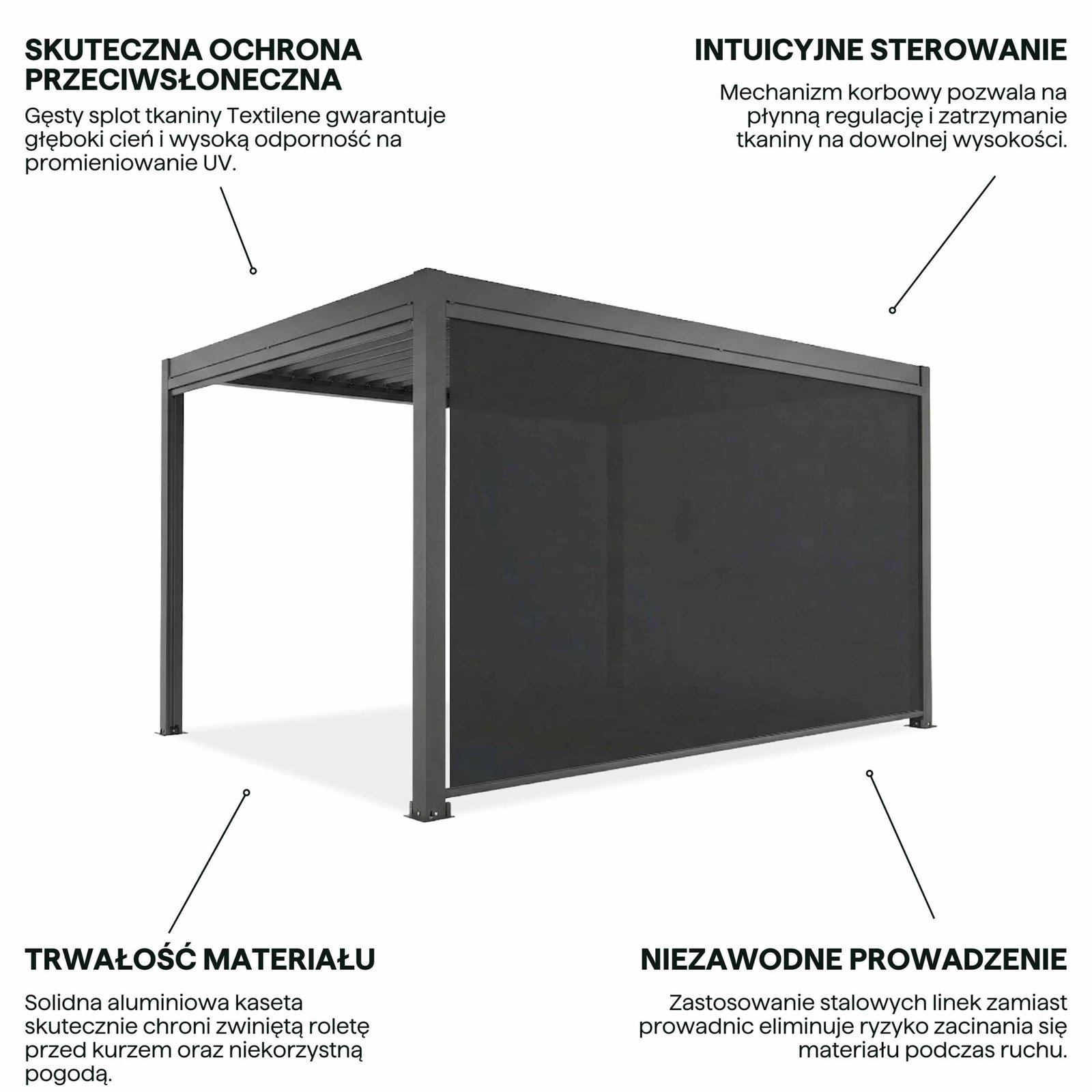 Roleta pionowa przeznaczona do pergoli z serii PRIMARY, wyposażona w solidną aluminiową kasetę, idealnie komponuje się z każdą nowoczesną aranżacją tarasową. Wykonana z materiału Textilene o wysokiej gramaturze, gwarantuje efektywne zacienienie, jednocześnie zapewniając cyrkulację powietrza. System stabilizacji na stalowych linkach uodparnia mechanizm przed zwyczajowymi problemami tarcia i klinowania. Precyzyjna regulacja wysokości za pomocą manualnej korby zapewnia elastyczność użytkowania.