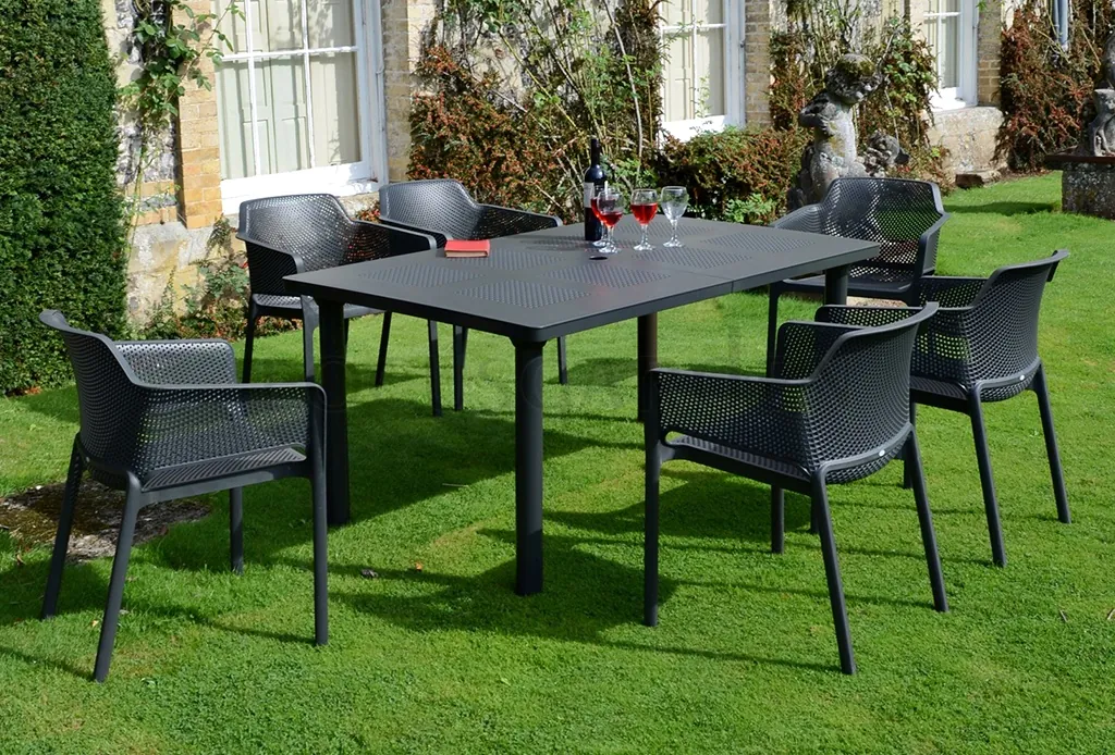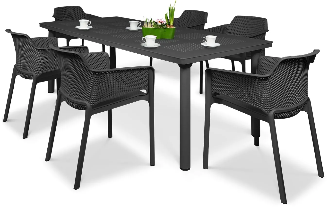 Zestaw NET/LIBECCIO 6+1 został zaprojektowany z myślą o wygodzie codziennego użytkowania. Ergonomiczne krzesła oraz przestronny stół zapewniają komfort podczas rodzinnych posiłków i spotkań towarzyskich na świeżym powietrzu.