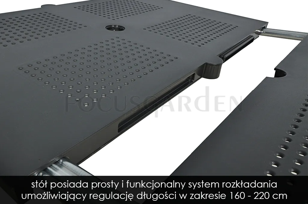 Stół posiada praktyczny system rozkładania, umożliwiający regulację długości w zakresie 160–220 cm. Dodatkowo wyposażony jest w otwór na parasol ogrodowy.